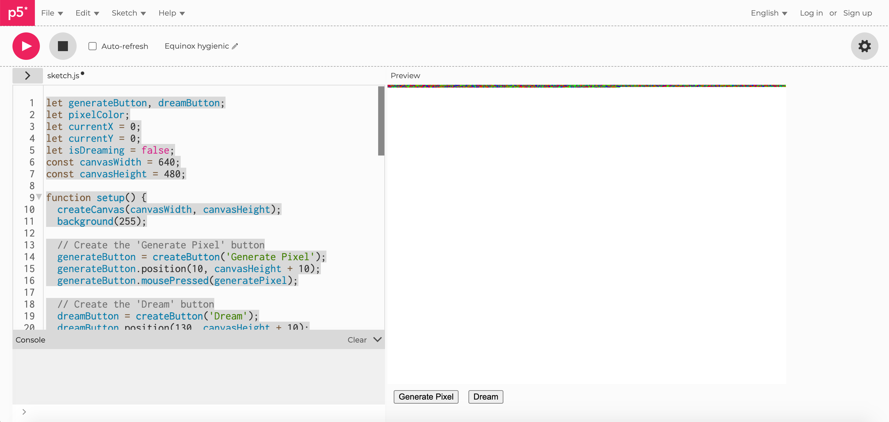 After pushing the button about 300 times, I had the sense that I had not yet automated my labor. Perhaps we should just automate the button pushing, as well. So I added a button, borrowing the nomenclature from Hugging Faces Dream Studio: “Dream.” Our dream is to be removed from the labor of generating randomness.