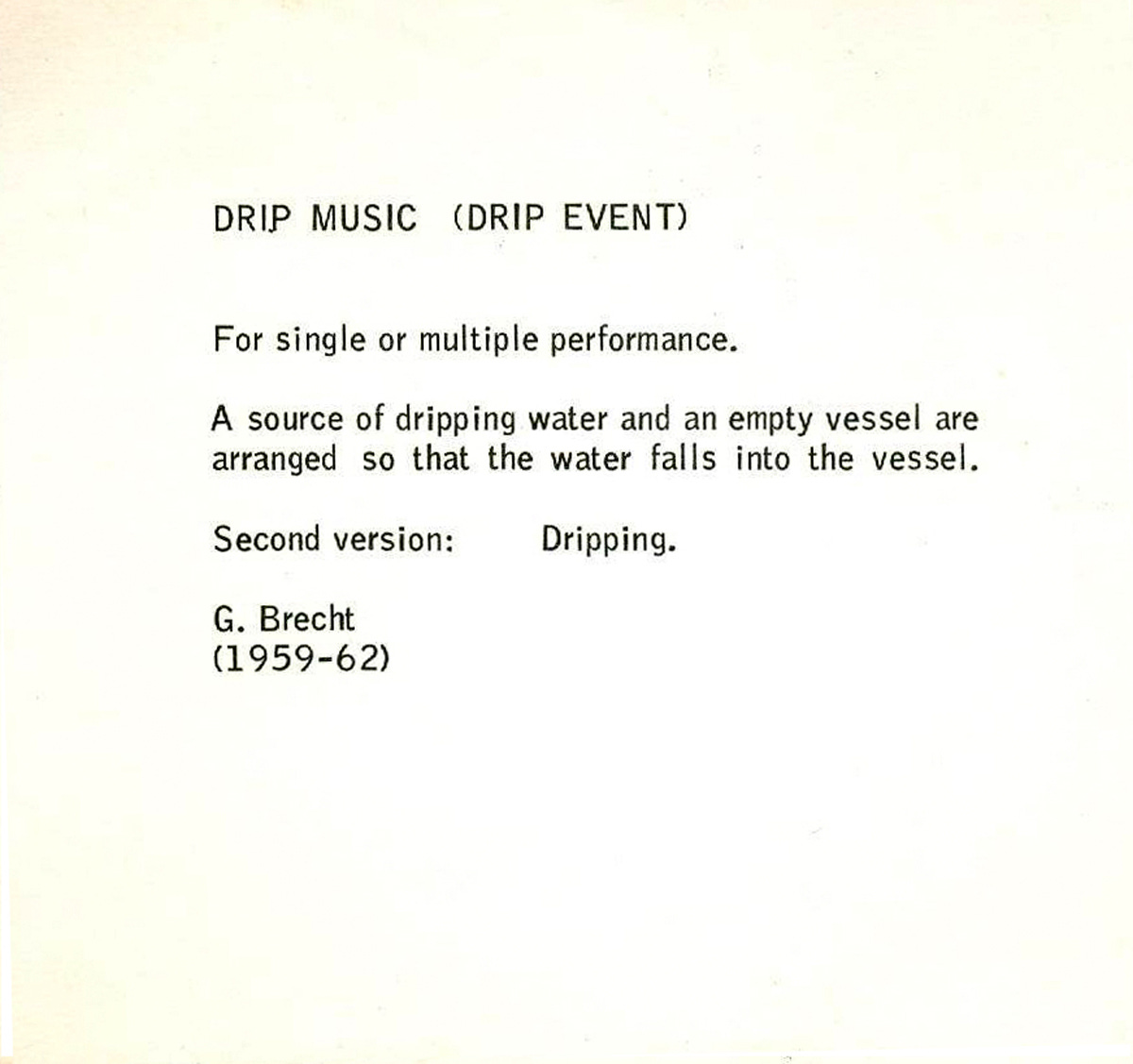 Here’s one example, Drip Music. Brecht has created an instruction for a musical piece. This musical piece shows a clear inspiration from pieces such as John Cage’s 4’33”. In Cage’s piece, the audience sat and watched him sit silently at a piano. The piece involved moving the listener’s attention from the piano player to the room around them. Brecht wrote many scores, and much of the Fluxus movement of the 1950s and 1960s were built around this new idea of music.