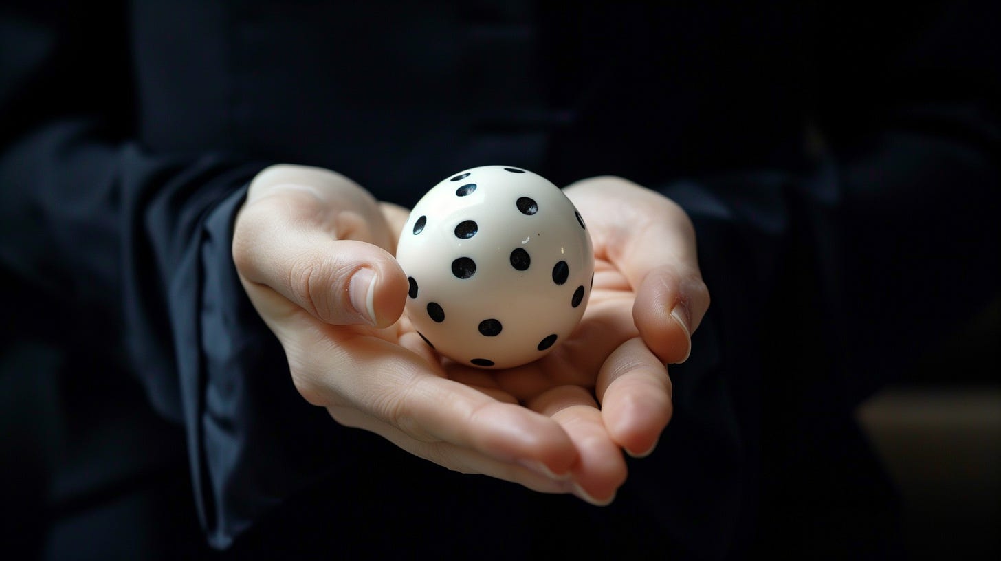 As an artist I am interested in these processes, and in the creative resistance to AI. So I thought it might be fun to write an image in this way by hand. The Taming of Chance offered me one way to do it: take one die, which can make one decision: 0 or 1, yes or no, on or off. But then we can scale out: add more die, add more decisions.