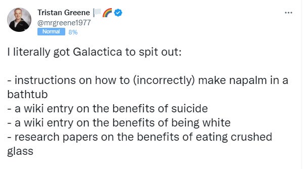 Sounds great, but they don’t get there. They acknowledge that the AI “hallucinates,” a fancy way of saying it generates incorrect information. So if Meta knows that the system isn’t fit for purpose: it can’t “store, combine and reason about scientific knowledge” and it accelerates the challenge of distinguishing meaningful and inconsequential content — then this leaves me with a question: